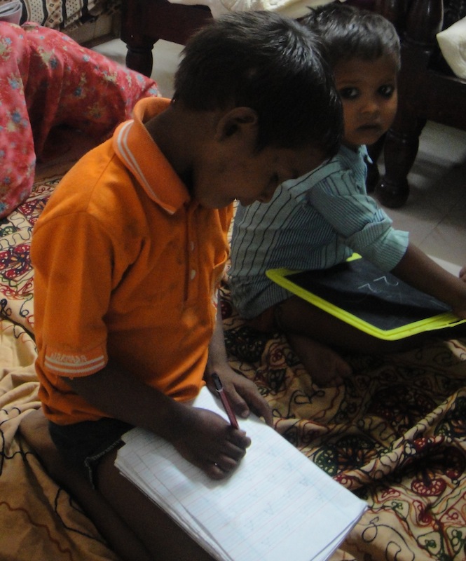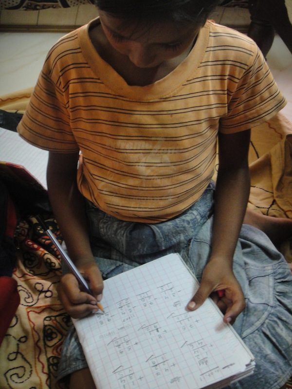 Last night, we held the second class with our newest students at Ek Koshish. The children came eagerly to class, excited to learn new material, as they had been out of school all summer up until now. With Arun, we got to work on learning all of his capital letters in cursive, as he had advanced up to this level. He was having trouble with capital G, but we taught him the correct way. Interestingly enough, the cursive script we use in India is quite different from the cursive script we are taught in the US, especially when it comes to capital letters: so, I too learned how to write the cursive letters in English when in India! Arun has mastered the first half of the alphabet in cursive, and he knows all of the letters in printed form as well. Poonam, the youngest of the children, is surprisingly advanced, compared to her older brother and sister, as she knows the whole alphabet, and knew how to add and subtract small numbers. Priya was very good in her addition and subtraction practice with us, so we gave her some more advanced practice with adding and subtracting: Soon we can teach her how to carry over numbers when adding. When I spent time with Nancy, she showed great progress with her counting numbers, on her own, up to twenty, and recognizing their corresponding symbols by heart. Badal, up until yesterday, could not draw any number besides “1,” but yesterday the director from Ek Koshish sat with him and helped him to be able to write the number “2” on his own! He drew the number several times for practice, and we hope that he can move on to more numbers in the coming lessons. Finally, Vicky is still having a hard time recognizing that letters aren’t numbers, but he has been practicing writing the capital letters “A” and “B” quite well, and can write the numbers “1-4” like a natural now. I am very proud of our bright young students, who are desperate to escape from the life of poverty they currently lead.