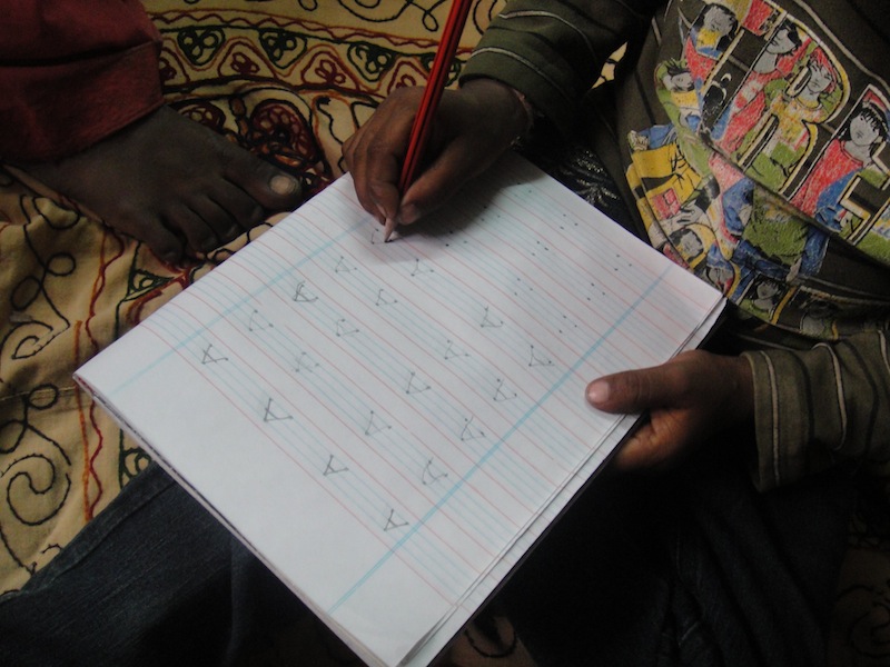 In our last lesson with our students from Ek Koshish, we accomplished a lot with our students who were interested in learning. I spent a lot of time with Vicky, making sure he understood the differences between the numbers 1, 2, and 3, which he was able to write well. He was very confused that each different symbol had a different name, because at first he would say that each of the symbols were simply the number 1. By the end of the lesson though, he understood it, but he will need to practice it a lot, because he has to take a lot of time to process the information and remember which symbol stood for which number. I also spent a lot of time with him on the letter A (capital). He can also write this one well, having learned how to properly hold a pencil, but he still thinks that the letter is one of the numbers. We do explain it to him every time, and he starts to understand; however, after ten minutes without persistently asking him, he quickly forgets and thinks that it is also a number. He is very bright though, and he honestly does try his very best, it will just take some time for the information to sink in. Otherwise, he is very attentive, never gives up, and walks into class with the biggest smile of all of the children!