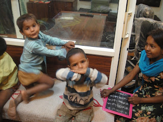 Yesterday evening we had our second day of classes for the women and children from slum areas in Faridabad! The children arrived a little late, but they got to work right away. First, our teacher distributed some personal-sized chalkboards to each of our students, which they enjoyed very much! The smaller children practiced counting English numbers and writing the number “1” on their boards. Vicky was a natural with his chalk, and he even moved on to drawing the number “2.” I have never seen a child take more interest in drawing the same number, repeatedly, at any angle, as I have seen Vicky! Badal was just getting the hang of how to hold the chalk and write properly, so we could only have him practice the number “1.” Ajay was pretty good at drawing, like Vicky, but he has less patience, so we moved on to listening exercises with him, while the rest continued practicing writing with chalk. Nancy was very good at learning numbers, as she practiced writing each number for the first time, while saying each number’s English translation while she wrote. Mohini already knew how to write numbers, but she did not know any symbols from the English or Hindi alphabets: so, we taught her ten symbols, and practiced each of them one by one with her. After mixing up each of the symbols, she was still able to distinguish the correct characters and their appropriate pronunciation.